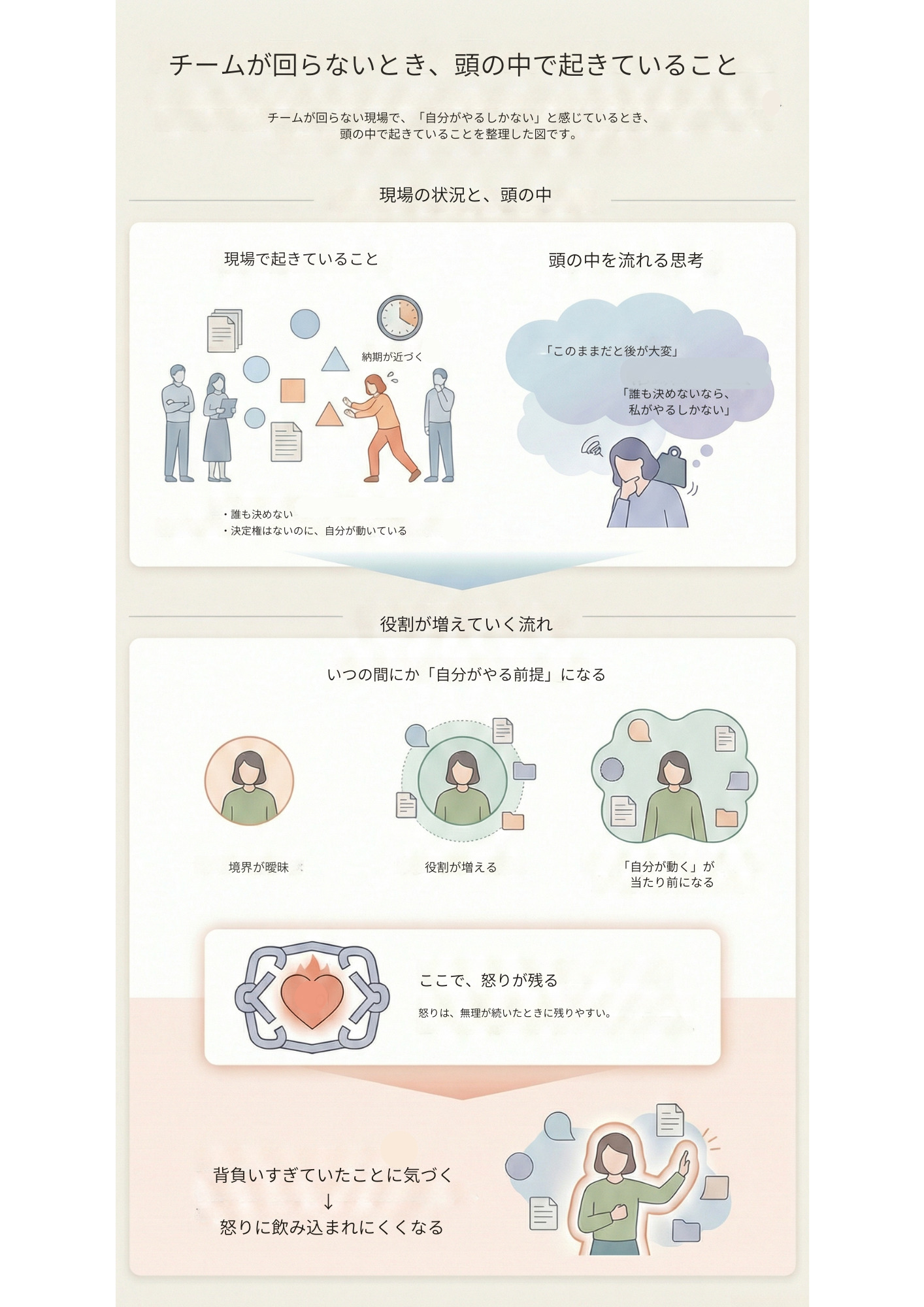 むしろ、チームが回らない現場で、自分が動く役を引き受け続けていると、怒りが出るのは自然なことだったりします。